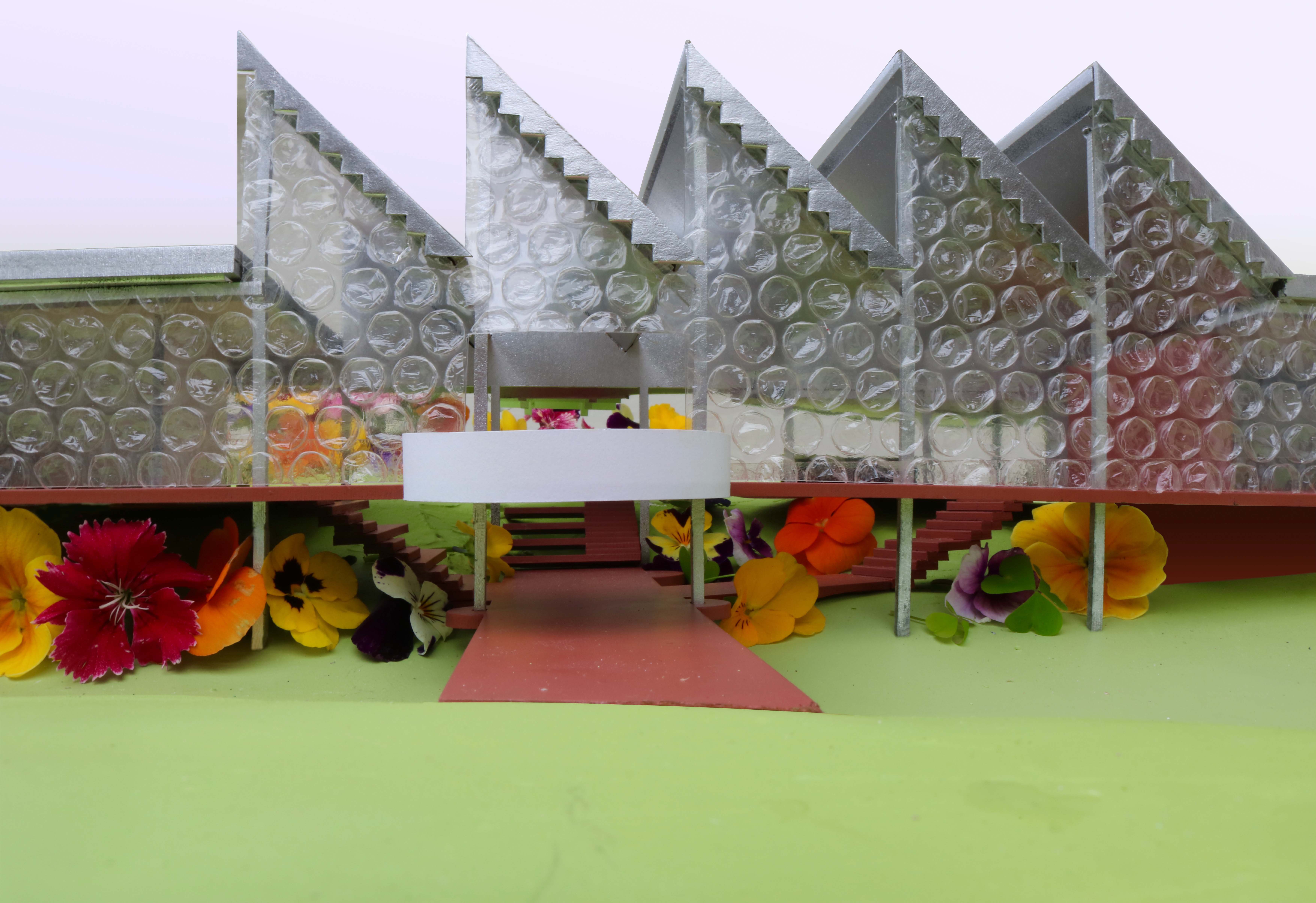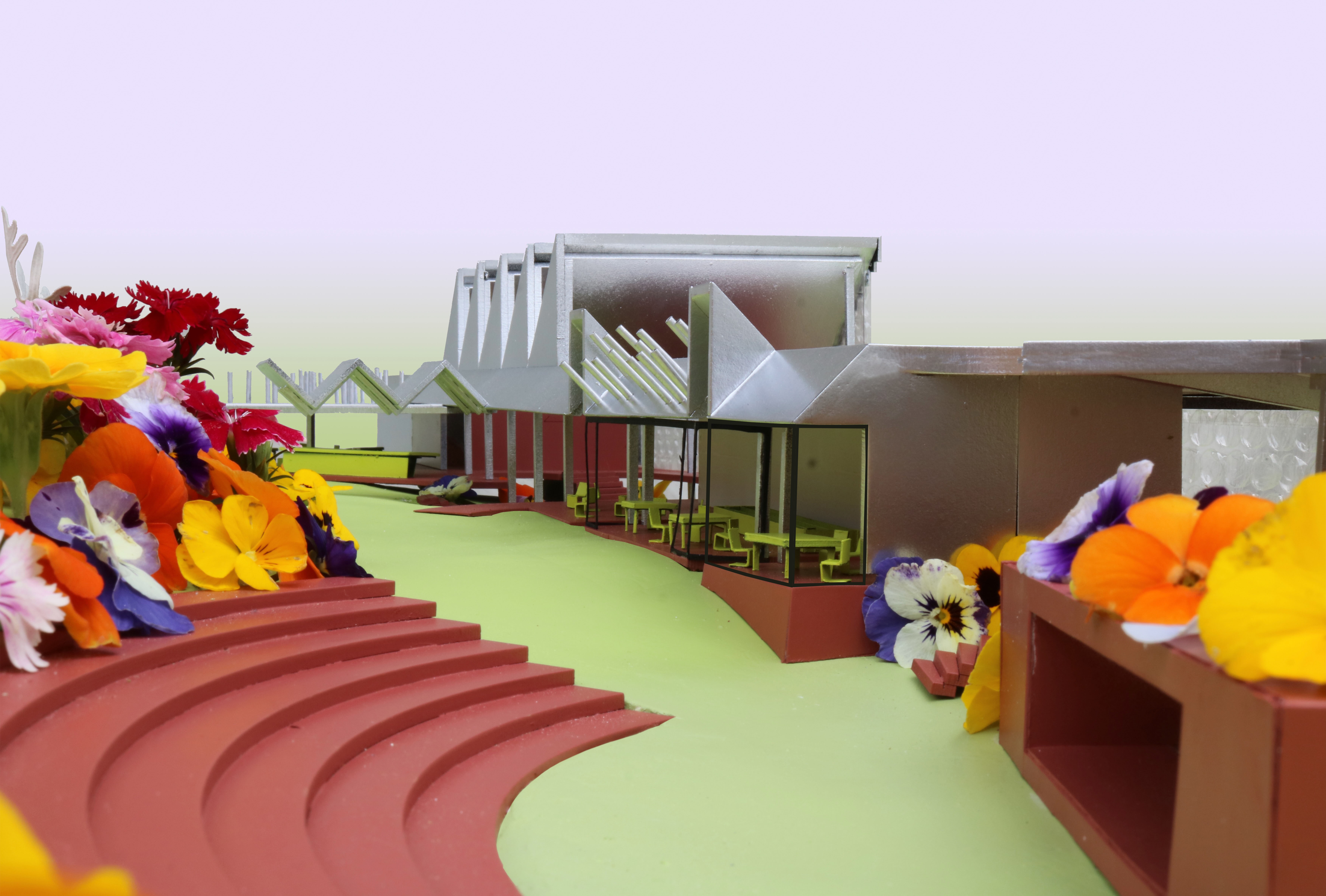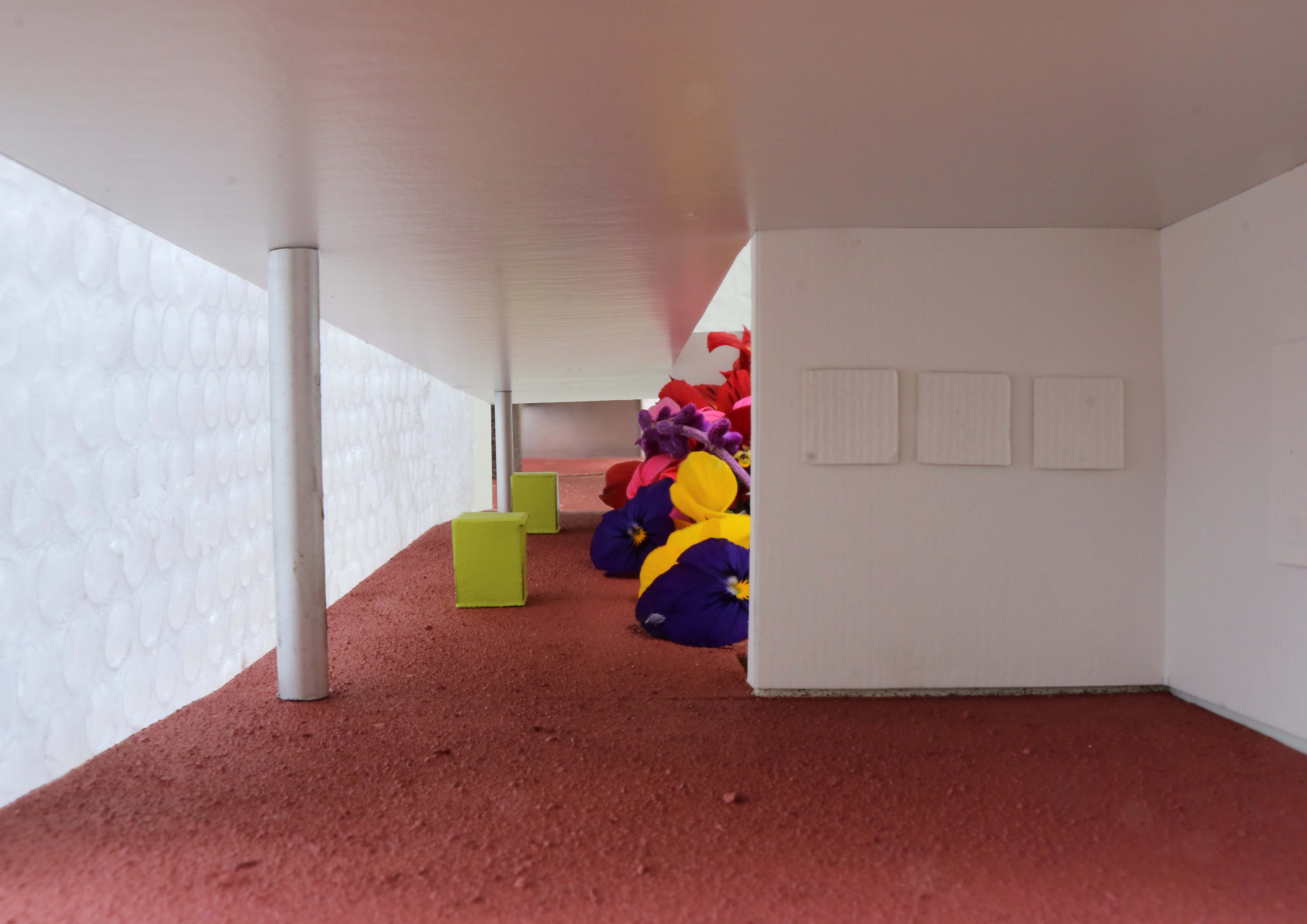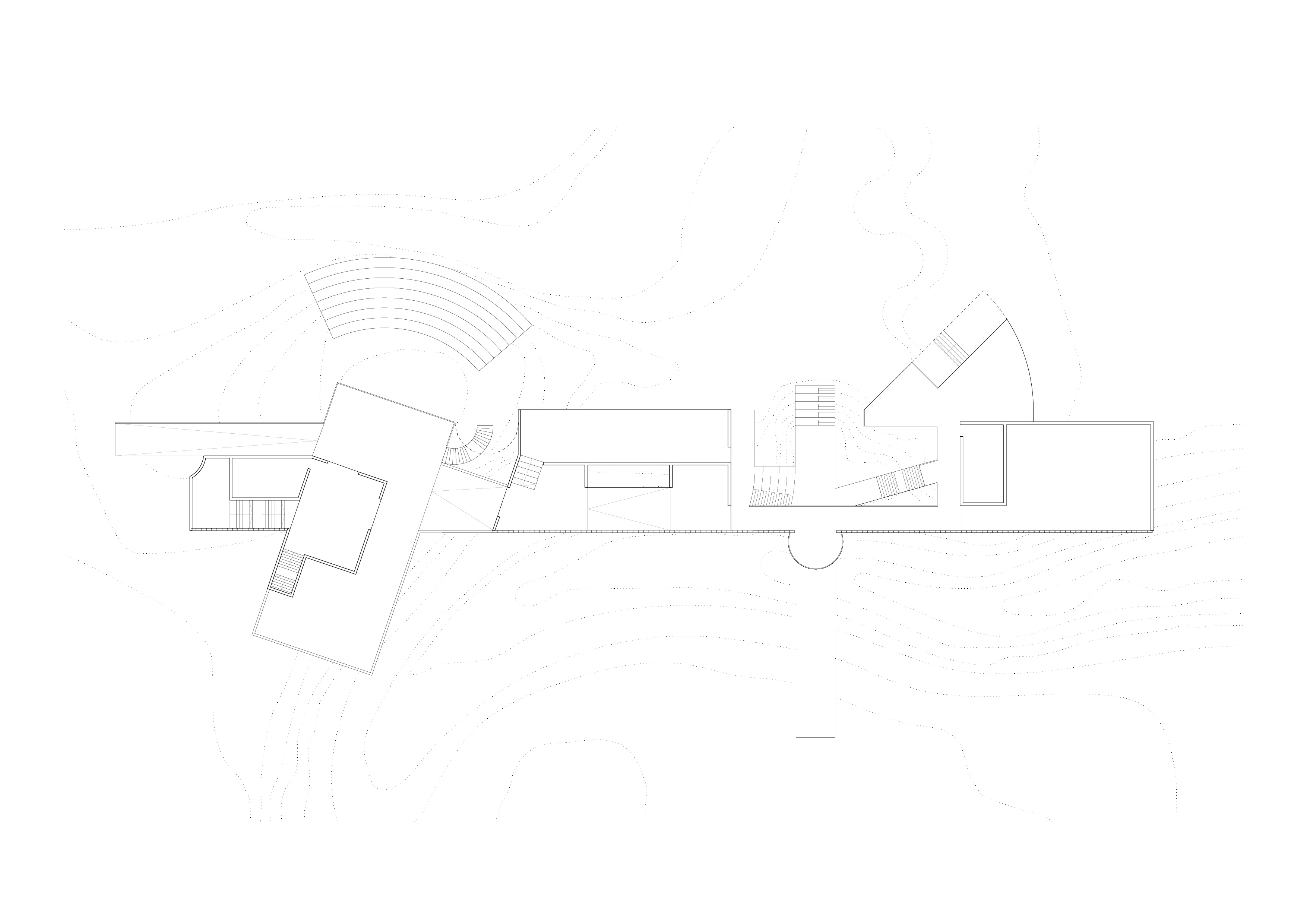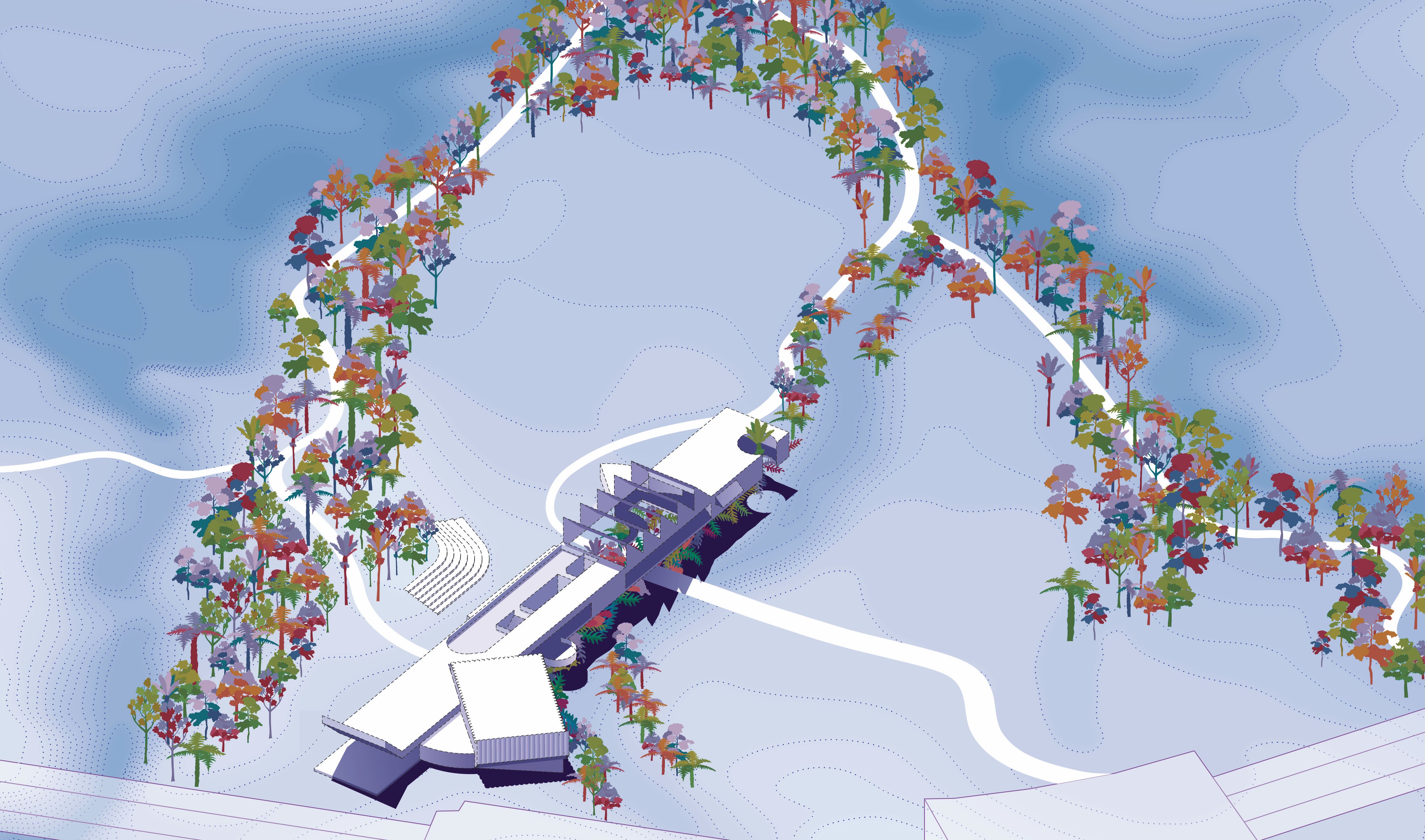 This project proposes a town hall as part of a wider, brand new development Tamaki Makaurau Auckland, Aotearoa. It contains two galleries, an auditorium, workshop spaces, a cafe, and various areas of internal/external ambiguity. It aims to draw people in from afar through bold forms and materials, including a 120 metre long glass block wall on the southern facade, before gently pushing them out further into the park and surrounding scenery.