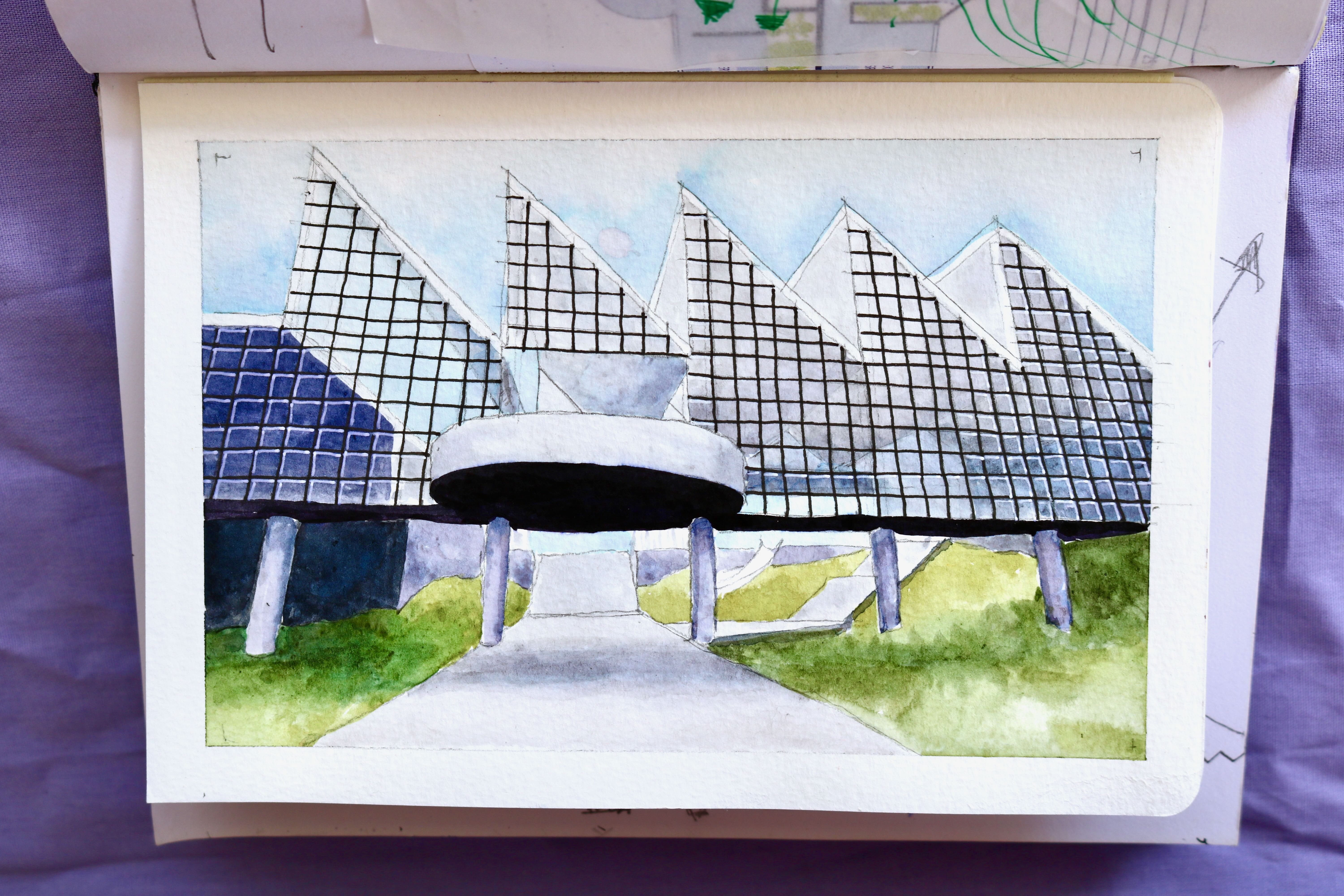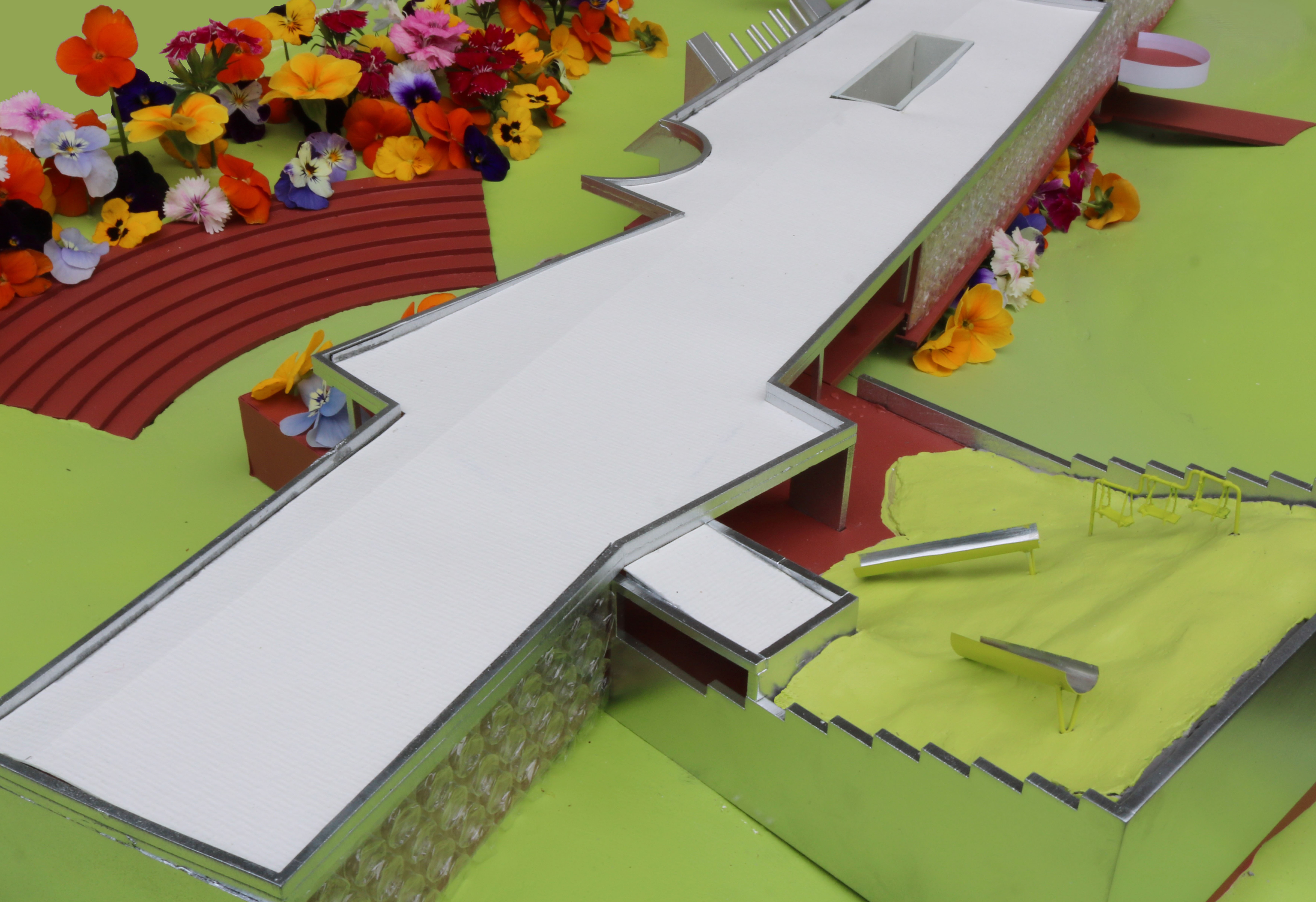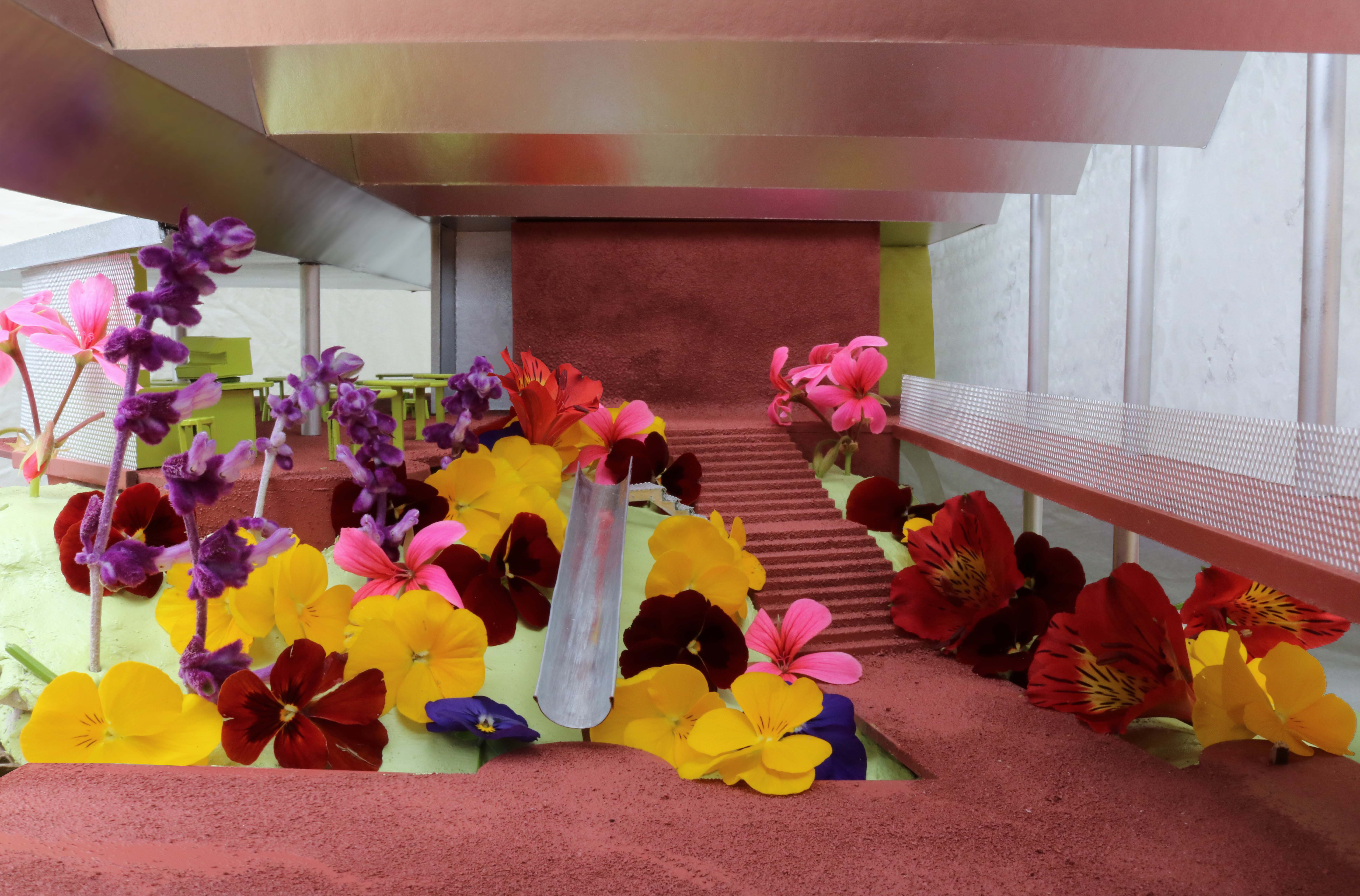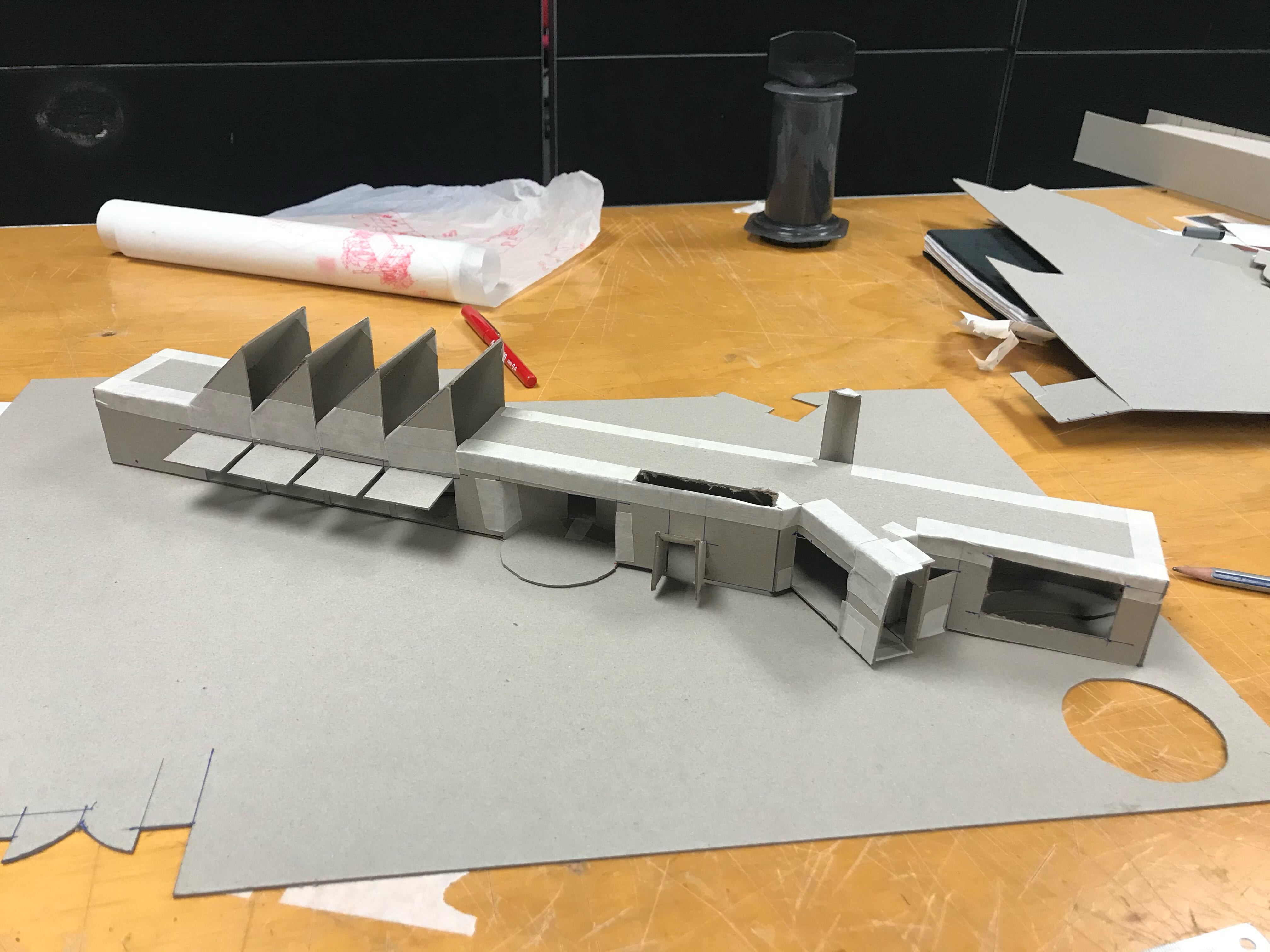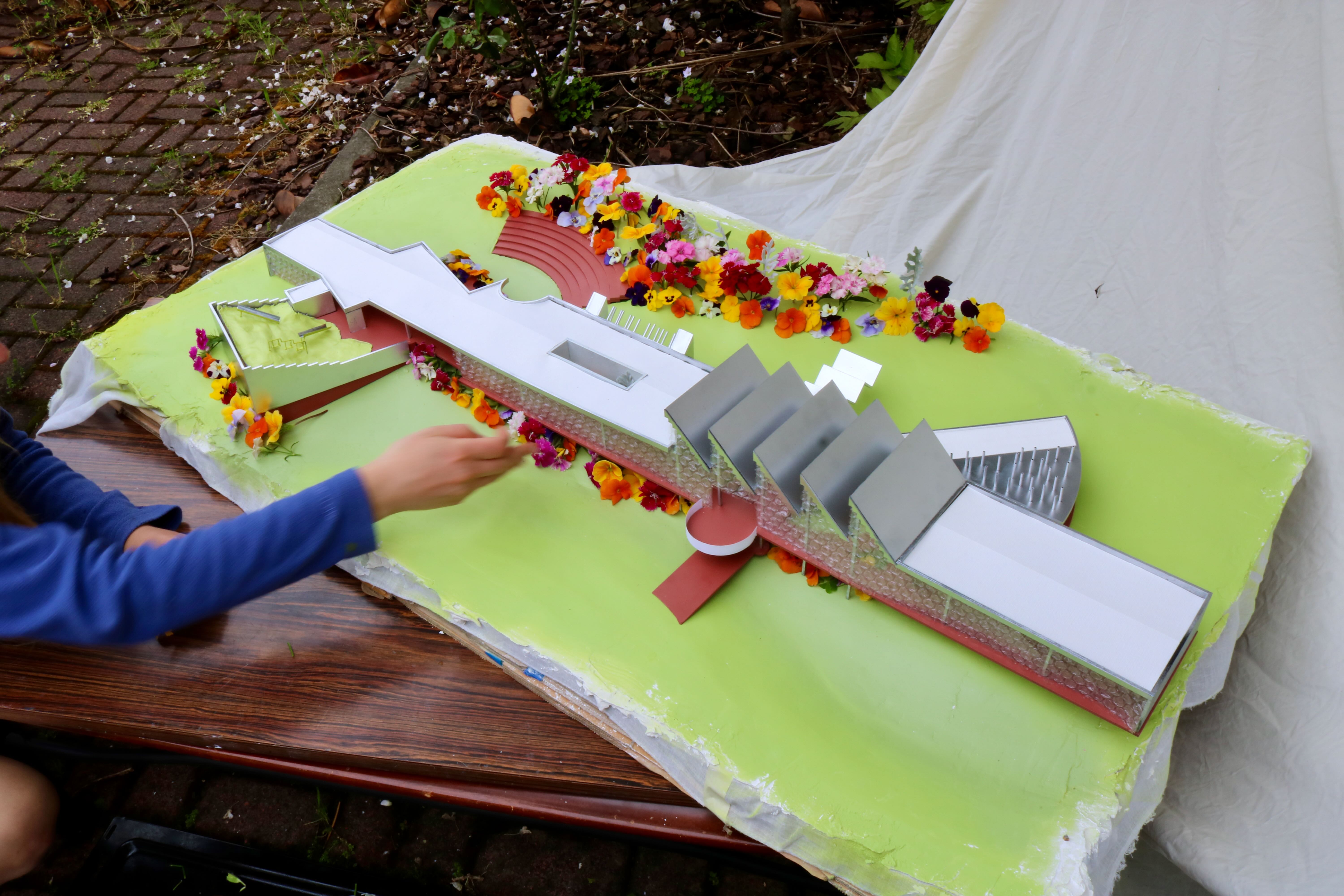 This project proposes a town hall as part of a wider, brand new development Tamaki Makaurau Auckland, Aotearoa. It contains two galleries, an auditorium, workshop spaces, a cafe, and various areas of internal/external ambiguity. It aims to draw people in from afar through bold forms and materials, including a 120 metre long glass block wall on the southern facade, before gently pushing them out further into the park and surrounding scenery.